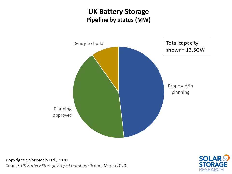 The total pipeline of battery storage projects in the UK has now reached over 13.5GW. The projects identified as being ready-to-build have received planning permission and have other leading indicators suggesting these projects are close to starting construction.