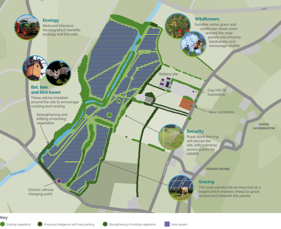 Conrad’s project is located south of the Clay Hill Pit Substation at Dormington and received planning permission in May 2022. The farm’s design was developed in consultation with the local community, which involves the creation of 40 hectares of native wildflower grassland and the planting of pairs of rare native black poplars. You can find the plans below.